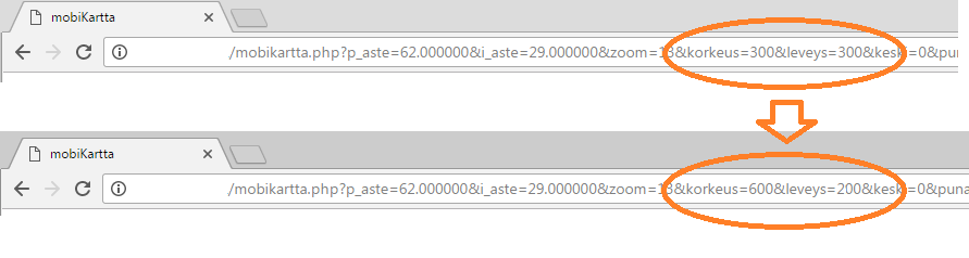 satelliittikuvan korkeuden ja leveyden voit säätää nopeasti haluamaksesi muokkaamalla osoitekenttää seuraavasti: